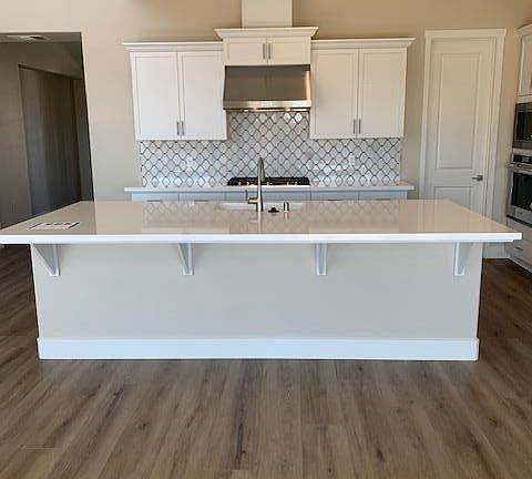 Beautiful balconyGourmet kitchenInviting front porchCalifornia roomBrushed nickel finishesCrisp polar white cabinetsDining area