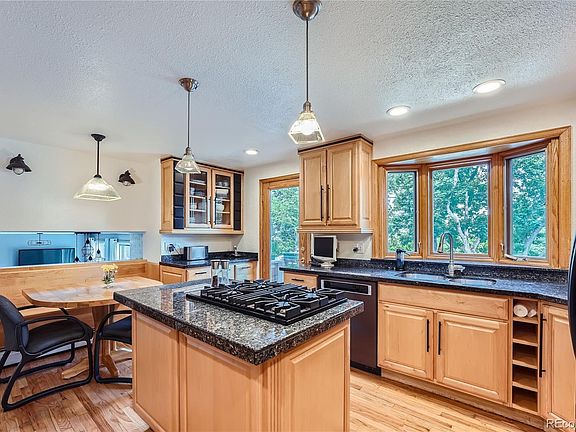 Perched high on a quiet cul-de-sac, this beautiful custom home provides views of both the mountains and the city lights. The private yard showcases mature trees, perennial gardens and multi-level decks which is the perfect backdrop for outdoor entertaining and hosting gatherings. Yours will be the home everyone wants to come to with the 20’ x 40’ heated pool with slide and diving board where memories will be created that will last a lifetime. Upon entering you are invited into the grand foyer where you see a bright, open floorplan with beautiful hardwood floors. The main level features a large Living Room with windows that run the length of the room allowing for an abundance of natural light. There is also a formal Dining Room and a remodeled eat-in Kitchen with island and access to an upper level deck. Just a few steps down you will enter the Family Room with wood burning fireplace and sliding glass doors to the main deck and pool area. There is also a fourth Bedroom/Office with large windows that overlook the fully fenced, private backyard. The updated 3/4 Bath and separate Laundry room finish this level. Head upstairs where brand new carpet and fresh paint provide a refreshing backdrop for this wonderful space. The Primary Bedroom Suite was opened to provide plenty of space including a sitting area, spacious walk-in closet, 5-piece Bath and a private covered deck with great views and skylights; truly a peaceful oasis to enjoy your morning coffee or to finish the day. There are two more Bedrooms, a full Bath and a Loft which opens to the foyer. The garden level basement features a flex space that is currently used as the Media/Home Theater room. The projector, built-in screen, sound bar and recliner theater seats are included. No HOA. 20 minutes to downtown Denver, 10 minutes to the mountains. OFFERING $10,000 FOR INTEREST RATE BUY-DOWN.