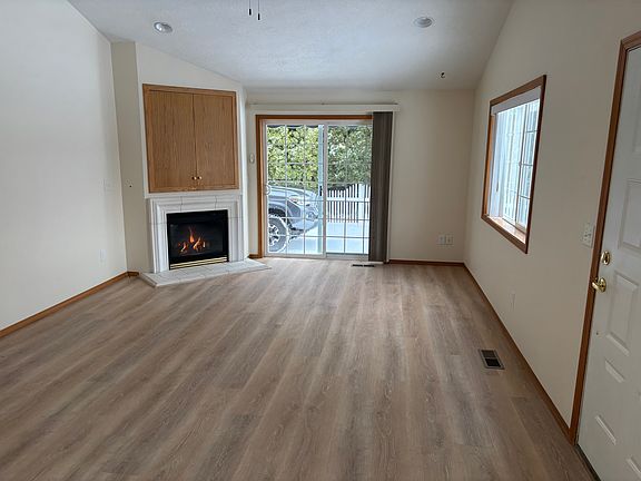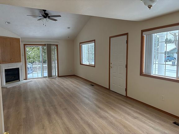 Corner lot duplex in great neighborhood. Freshly painted with new LVP flooring throughout. New carpet in bedrooms with extra plush padding giving the bedrooms a very cozy feel. This home is light and bright throughout with large windows in bedrooms, window in bathroom and a skylight in main bathroom. The main living space is open concept and has large windows that fill the room with natural light. Living room has vaulted ceiling with gas fireplace and ceiling fan. With a sliding door in the living room and a door in bedroom that open to a fenced in patio space. Kitchen has new refrigerator, over the range microwave and dishwasher. Oversize garage with laundry hook up and cabinets for storage. Tenant is responsible for utilities. First months rent plus security deposit due at signing. Yard and utilities are tenants responsibility. No smoking. I may consider a small dog.