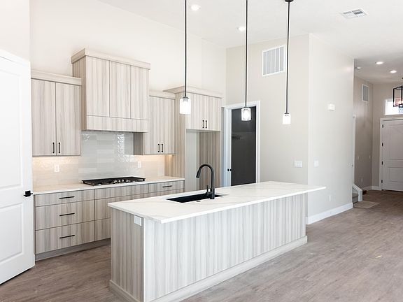 Vaulted 13-ft ceiling over an open great room and gourmet kitchen with quartz countertops, soft-close cabinetry.