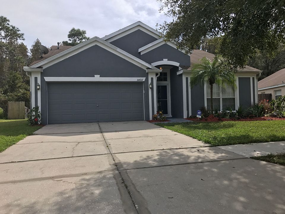 MUST SEE! BUYERS AGENTS WELCOME! Beautiful home with 3 bedrooms, 2 baths and attached 2 car garage featuring over 1500SF. Situated in one of Wesley Chapel's most popular communities. Located in Meadow Pointe in the gated community of Iverson, it is minutes from I-75 and Bruce B Downs, making it easy access to shopping and commuter routes. Low HOA fee. NEW Hickory hardwood laminate flooring in main living areas and master bedroom. Custom tile flooring in master bath. Freshly painted inside and out. The eat-in kitchen features recessed lighting and lots of counters and cabinets, all stainless steel appliances with gas range, pantry and breakfast bar and overlooks the family room. There is a breakfast area in the kitchen too. The Family room looks out over the rear screened patio, which includes a hot tub. Bedrooms are in a 2-way split arrangement. The master bedroom suite features an extra-large walk-in closet, dual sinks and garden tub with separate shower. Vaulted ceilings with fans. Newly landscaped, with sprinkler system utilizing reclaimed water, making watering bills very low. All highly rated and sought after schools including Wiregrass Elementary, John Long Middle School and Wiregrass Ranch High School.