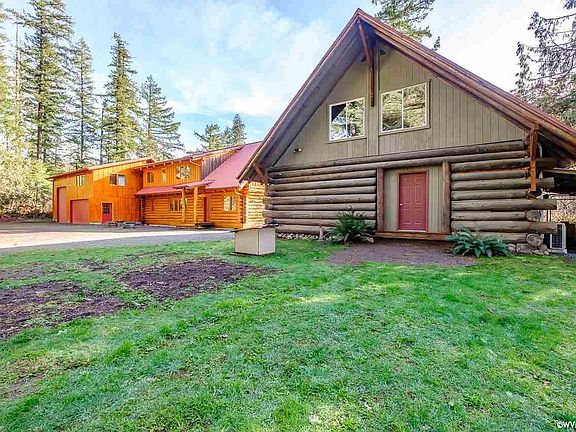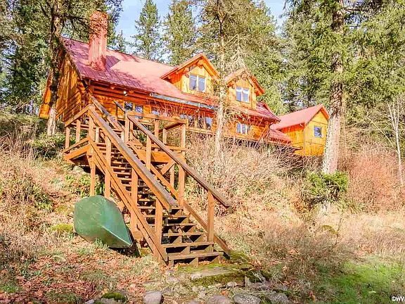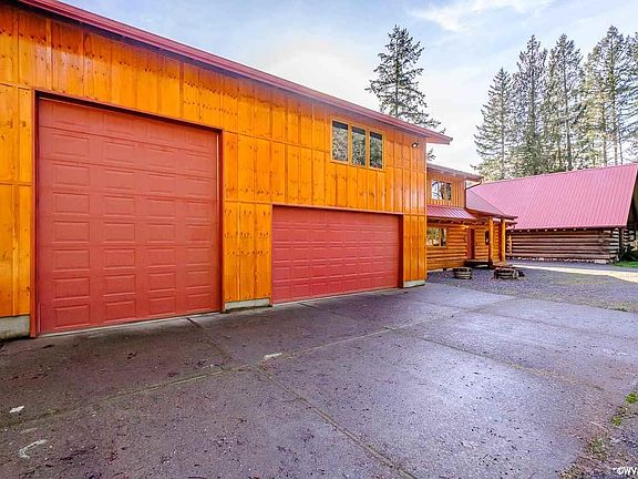 Magnificent one of a kind riverfront property. Enjoy behind a locked gate a long PRV drive through 13 acres of forest. A creek adjacent to the driveway. 1,700 ft of private river frontage. Features a beautiful waterfall, eagles, hawks, osprey. Salmon, steelhead and trout fishing. Log home has such attention to detail with carved pillars, massive interior logs, rock fireplace and big windows facing the river. Rv garage/shop. Add'l 30x36 log barn w/workshop below, full living Qrts above. Come be Astonished!