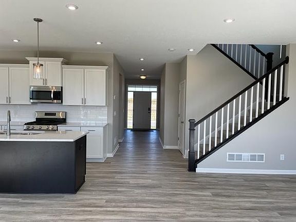Ready for move-in! Home features PELLA windows, covered front porch, unfinished walk out lower, landscaping, sod, and irrigation system. Main level highlights include a spacious kitchen with walk in pantry & large center island (room for 4-5 stools), den with french doors, great room w/fireplace including floor to ceiling stone & mantle, decorative stair rails, spacious mudroom with walk in closet & half bath, Upper level features private primary suite with box vault ceilling, primary deluxe bath with ceramic tile shower & separate soaking tub, 3 additional bedrooms, versatile loft (can be used as a family room or office), laundry room with sink cabinets, and a full bath with double sink vanity. All measurements are approximate.