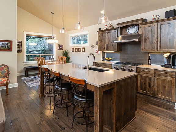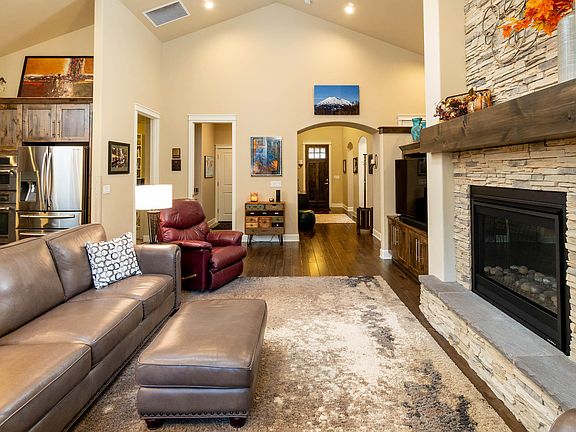 Live in this gated community of Rivers Edge & be a part of the HOA owned golf course situated along the walking path to downtown with views of the course. Single story Pahlisch built beauty with 2005 SF. Great rm is open to the kitchen and dining area w/ ''Heat & Glo'' gas fireplace, wonderful built-in cabinets, gleaming hardwood floors, vaulted ceilings & ''walls of glass'' overlooking the covered patio. Gourmet kitchen includes center island, breakfast bar, walk-in pantry, quartz counters & cabinets galore. Primary suit is separate from guest suites allowing complete privacy. You'll also see coved ceilings, dual vanities, huge walk-in closet with built-ins, soaking tub & walk-in shower. Enjoy outdoor entertaining on your covered patio w/ fireplace, ceiling fan, pavered patio & lush landscaping. And much, much more!