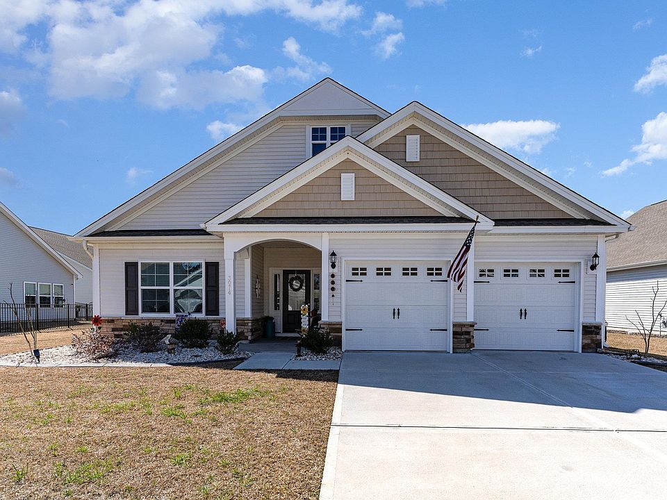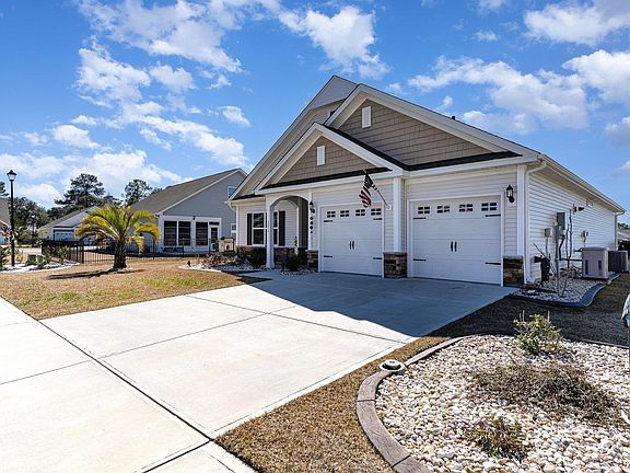 Nestled in the desirable Cypress Village community this stunning Mungo home offers a perfect blend of modern elegance and coastal charm. From the moment you arrive, the home’s inviting curb appeal, featuring a beautifully landscaped yard and a charming front entry way with a waterfall paned glass front door, sets the tone for the warmth and sophistication found within. Inside, as you step through the foyer there is an expansive open floor plan welcomes you with soaring vaulted ceilings, rich engineered hardwood flooring, and an abundance of natural light. The spacious living room, anchored by a cozy gas fireplace and accented by a stylish accent wall, provides a perfect setting for relaxation and entertaining. Large windows frame serene views of the pond and backyard, seamlessly blending indoor and outdoor living. The kitchen is a chef’s dream, boasting gleaming granite countertops, gas stove & range an oversized work island with bar seating perfect for entertaining, crisp white cabinetry with updated black handles, and a subway tile backsplash. Adjacent to the kitchen, a charming dining area with custom lighting creates an inviting atmosphere for family meals or entertaining guests. The luxurious primary suite is a private retreat featuring a tray ceiling with ceiling fan and a spa-like ensuite bathroom complete with a double sink vanity, tiled shower, and a spacious walk-in closet. Inside the walk-in closet are custom built-ins for a home workstation complete with lateral files and computer connections. Additional bedrooms are equally well-appointed, featuring ceiling fans and offering ample space and comfort for family and guests. There is also a laundry room with shelving perfect for your needs. Step outside to the enclosed Carolina Room with a ceiling fan and plenty of windows to enjoy all the natural light all year round. Outside enjoy the serene backyard oasis, where a pergola provides a shaded retreat on the back epoxy flooring patio for outdoor dining or morning coffee. The sunsets at this home are truly breath taking and a great way to wind down after the hustle and bustle of your day. The meticulously landscaped, fenced-in yard offers both privacy and beauty, making it the perfect space for pets, gardening, or simply enjoying the beautiful coastal climate with views of the pond. The home also features an insulated garage with ceiling fan and epoxy finished floor. There is also a 12KW Briggs and Stratton Generator installed. Beyond the home, Cypress Village provides resort-style amenities, including a clubhouse, pool, fitness center, library, kitchen, gathering room with fireplace, pickleball, bocce ball, fishing, grilling area and putting green. This is a very active community with events all year round. You are just minutes from the Intracoastal Waterway, pristine beaches, world-class golf courses, and the vibrant shopping and dining scene of the infamous Little River waterfront. Don’t miss this exceptional opportunity to own a piece of paradise in one of Little River’s most sought-after communities! Buyer is responsible for verification.
