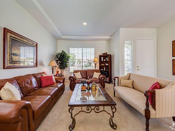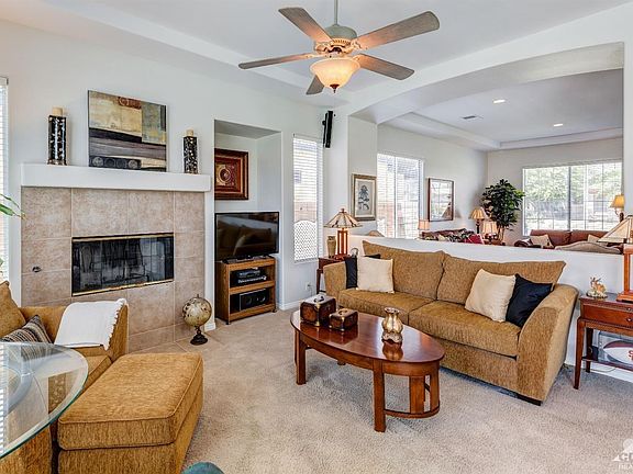 This beautiful pristine home is located in a nice quiet area known as Tapestry in Cathedral City. With three bedrooms two including wall mounted flat panel TVs,two baths,living rm,separate formal dining room and family room with cozy gas fireplace there is no shortage of living space here! Your backyard is very private and perfect for lounging by the pool/spa and enjoying your covered outdoor built in barbecue island with misting system for desert life style entertaining 10 foot high ceilings provide lots of natural light in all the rooms of the home. Spacious master bedroom and a large master bathroom and the guest bath have new quartz countertops,new dual sinks and hardware and new toilets.These are just a few of the amenities this home has to offer. Let's not forget new GE profile appliances, new glass tile backsplash,walk in pantry and Cambria quartz kitchen center island that flows into the family room. No HOAs and on fee land(you own it) truly makes this home a special offering.