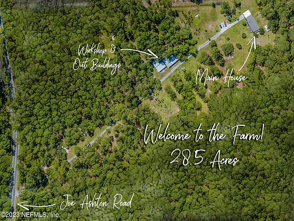 Welcome to ''The Farm'', spanning 28.5 acres this property offers a park-like setting just minutes from the St Johns River. Located in highly desirable St Johns County, conveniently situated on Joe Ashton Rd which can be accessed via State Rd 13N or CR 208. A quick drive to 15 minutes to I95, Publix Greenwise super-market, World Golf Village, Costco, St Augustine Outlets & the newest Baptist Medical center (set to open in spring 2024!). Over 80% of this special property is populated by mature agricultural land and is made up of 4 total parcels. For years this property has been left untouched with just over 5 acres cleared and lovingly developed for the family home and business. As you enter the property a meandering tree-lined private lane will lead you to the main residence, you will appreciate the care that has been taken to preserve the natural beauty of this land. The property offers a custom built, immaculately maintained log cabin home featuring 3 bedrooms / 2 baths and a 2 car carpet with porches on both sides of the home to enjoy incredible sunrises and sunsets. A new roof was installed in 2023, the property also has 2 artisan wells and a septic tank. Other buildings on property are a "she-shed", large air-cooled outbuilding, enclosed wood shop and 2 secured sheds. High and dry, fully fenced with a gated drive. This property is a total of 4 parcels being sold together - 3 of the 4 are currently zoned Timberland (80-89), the fourth is zoned Single Family Residential. Parcel ID's being offered for sale; #0138900050, #0138900051, #0138900052 & #0138900090. Nature enthusiasts will appreciate the presence of an active spring-fed creek, that meanders across the southern border of the property, charming nature trails and wide open spaces. Conveniently located near all amenities, yet tucked away from the hustle and bustle.
