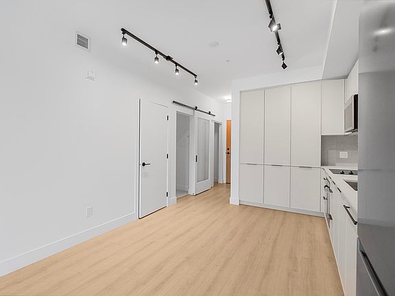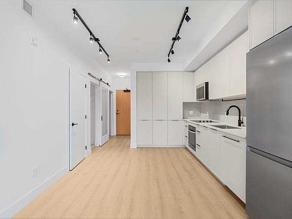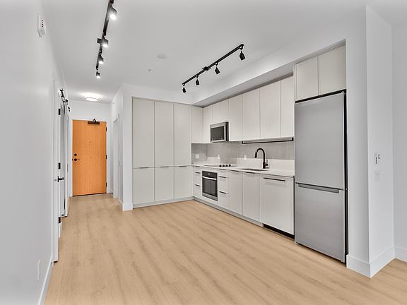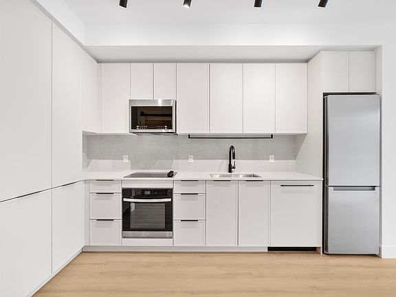 Bright and airy residenceHigh ceilingsExpansive windowsStylish kitchenQuartz countertopsSleek cabinetryFull-size stainless-steel appliances