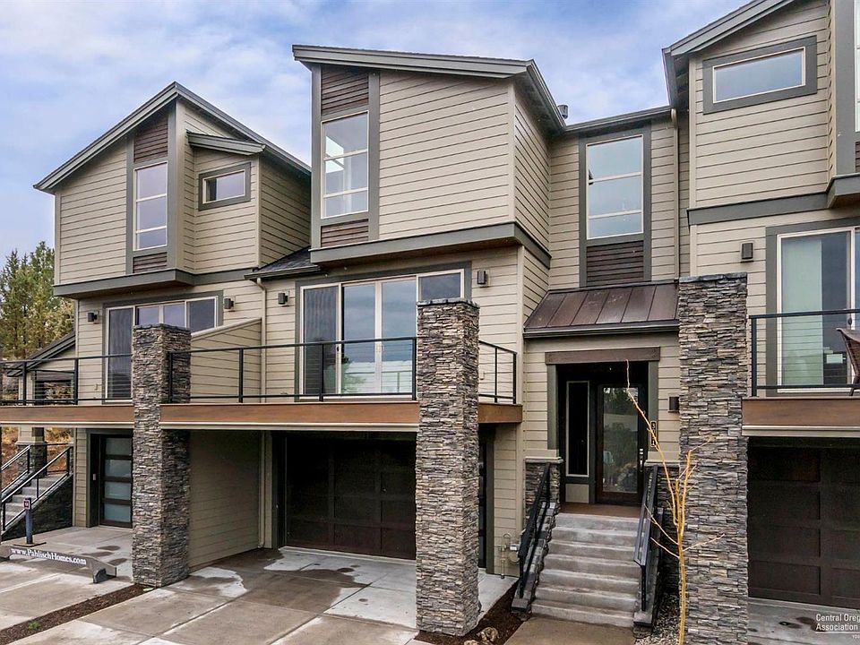 This spacious townhome you'll find tucked in Rivers Edge Village in a secluded new home community. Walk out your front door and be on the Deschutes River Trail within just a few steps. This community is close to shopping, parkway access and within minutes of The Old Mill District and Downtown Bend. The home features luxurious finishes, an open and airy floor plan with lots of natural light. In the Mahoney Plan you'll experience an open floor plan with space for entertaining, gourmet kitchen and large eating bar. The expansive master suite has a large tiled shower, dual vanity, large walk in closet, separate water closet, bonus space with a full bath, Pocket den off of the kitchen, Great room with gas fireplace and built in cabinets. Bonus area with full bath that can be a bedroom, office or guest suite. The large deck views of Pilot Butte, great for watching the fireworks. Photos are of actual home.
