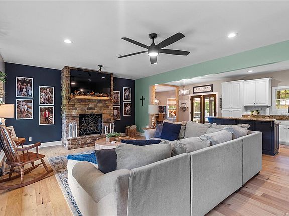 Step inside to find an inviting open floor plan where the living room centers around a stacked stone fireplace, perfect for cozy evenings at home. The kitchen is bright and functional with granite counters, stainless steel appliances, an island with seating, and freshly updated cabinetry. The spacious primary suite features a custom accent wall, walk-in closet, and a bath with double vanities, granite counters, soaking tub, and tile shower.