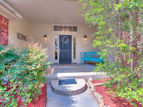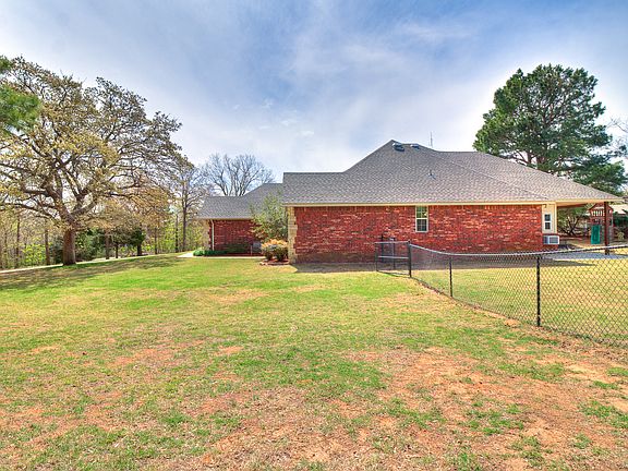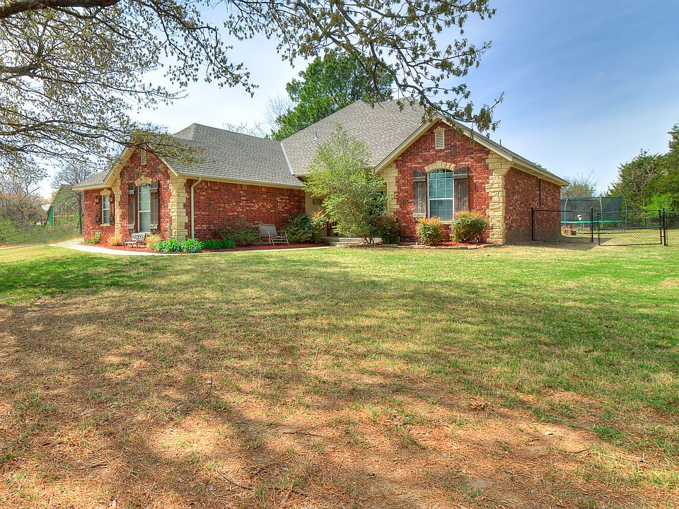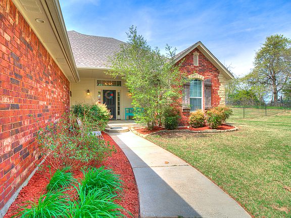 Lovely, warm and inviting home on 1.1 acres, with beautiful setting boasting of open floor plan, fabulous kitchen with stunning finishes to include granite counters, lots of counter space and cabinets, pot filler, lazy susan, island, under and over cabinet lighting and more. The functional floor plan includes split beds, study with closet, pocket door and glass doors from living, 2.1 baths. Enjoy the great room with fireplace with blower and gas logs. The master suite features trey ceiling with lighting, double sinks with vanity and walk-in closet adjoining the laundry with cabinets and counters. Circle drive leading to over-sized 3 car garage with storm shelter. Enjoy the sunsets on the covered patio. Easy commute to Tinker, and all the metro.