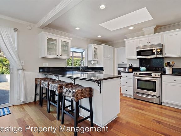Set on a winding cul-de-sac, this charming ranch is sure to delight! Stunning wood floors welcome you in and are sure to impress all who enter. Open floor plan with living room flowing into dining/kitchen areas and straight out to one of the prettiest backyards around. Sunny, private yard with bubbling fountain, sophisticated landscaping, stamped concrete patio and spa tub simply perfect for relaxing and entertaining! Gorgeous kitchen with a touch of elegance midnight granite counters, stainless steel appliances, display cabinetry and even a skylight! Spacious master suite includes a contemporary dressing area and updated bathroom with riverstone tile shower. Remodeled hall bath, recessed lighting throughout, all new paint. Attic ceiling fans. Close to shops, schools, parks, and just a quick drive to nearby beaches. Turn key beauty - move right in!