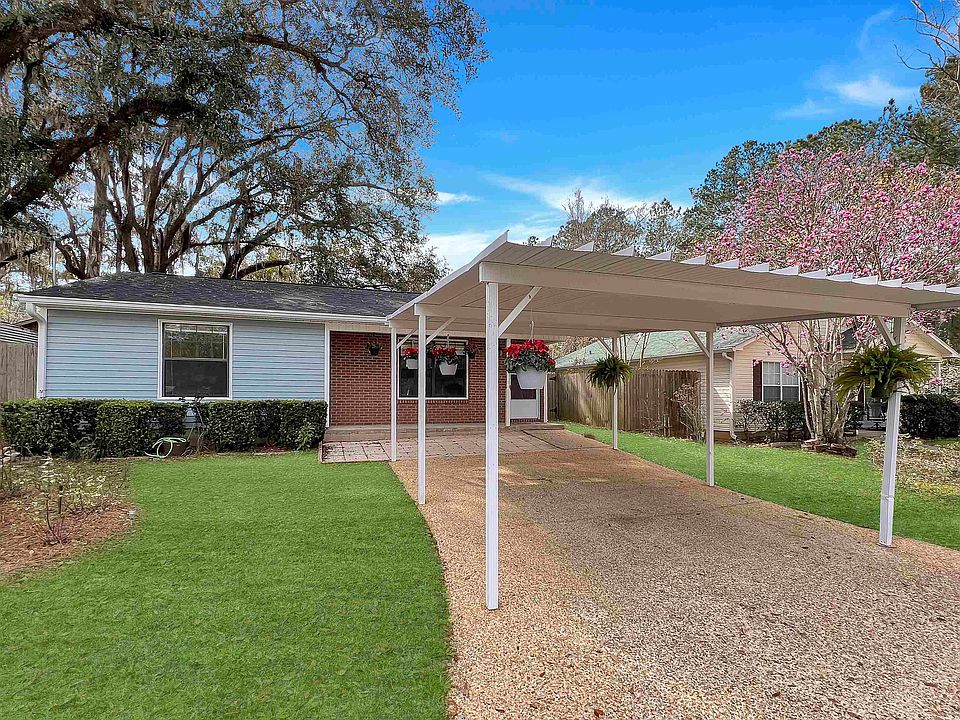 Move-in-ready with a New 2023 roof, 2022 water heater, 2018 HVAC, new dishwasher, new paint, renovated primary bathroom, and new carpet! Enter the home from the covered front porch to the main living area centered around a floor-to-ceiling brick fireplace. Just off the kitchen featuring white appliances is a dining room area overlooking the fenced back yard which boasts a patio with thoughtful paver accents. The primary suite is home to mirrored closet doors, and a walk-in shower. The second bathroom is centrally located between the second bedroom and main living area, and the indoor, oversized utility room features built-in shelving.