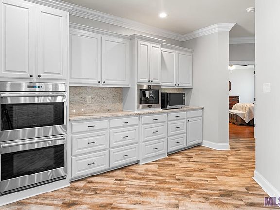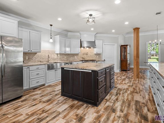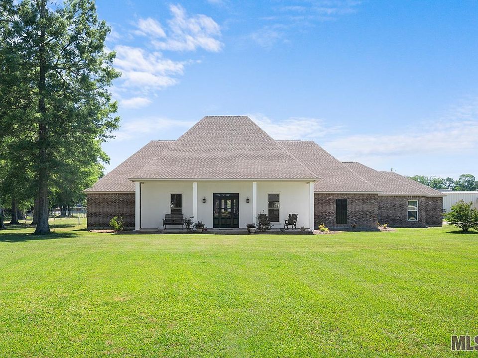 Welcome to this luxurious 5 bedroom, 3 bath home nestled on a sprawling 4.13 acres in Denham Springs. As you step inside, you'll be greeted by an inviting open floor plan adorned with gleaming hardwood flooring, triple crown molding, and recessed lighting throughout. The living space boasts a wall of windows that floods the room with natural light, and the custom built-ins add both functionality and charm to the space. The formal dining area adjacent to the living room sets the stage for memorable gatherings. The heart of the home lies in the spacious kitchen, complete with a dining area, breakfast nook, and a generous 16-foot bar, perfect for casual meals or entertaining guests. Stainless steel appliances, including a gas range and wall oven, elevate the culinary experience, while a built-in espresso machine and coffee bar add a touch of luxury. Custom white cabinetry, a large pantry, and an expansive island provide ample storage and workspace. The laundry room is a haven of organization, boasting abundant cabinetry and a convenient folding bar. Each of the bedrooms is spacious with ample closet storage. The master suite is a sanctuary of relaxation, featuring a large soaking tub, a separate shower, and a spacious walk-in closet. A separate sitting room, complete with a cozy gas-log fireplace, offers a space to unwind after a long day. Enjoy your evenings outdoors under the extended covered patio or on the open patio, enjoying views of the expansive backyard. Additionally, a 2,000 sq ft apartment provides the perfect space for a mother-in-law suite or rental income opportunity. The property boasts a 5,000 sq ft metal shop, offering the potential for a home-based business or additional storage space. Located in Flood Zone X. Call for your private showing today.
