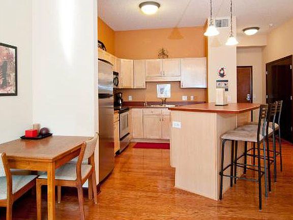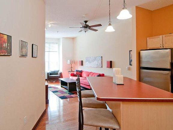 Like new condo with large windows, 10'high ceilings, hardwood floors & open floor plan with kitchen island. Underground heated parking, shared patio, elevator, wired for sound AND in-unit laundry. Storage area behind garage stall.
