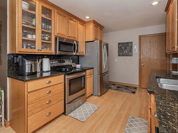 Welcome to this classic ranch-style home, meticulously maintained and ready for new owners. Covered front porch adds great curb appeal and instantly welcomes you inside. The spacious living room features hardwood floors that add warmth and character plus you'll absolutely love the beautiful kitchen - abundant quarter sawn oak cabinets & black granite counters create an elegant and timeless feel. Adjoining breakfast nook plus a formal dining area provide the perfect eating/conversation area. Cleverly hidden office/work station can be found behind the solid wood doors within the dining room. Desirable main floor laundry with a generous size mudroom provides easy access to/from the heated, attached garage. Two spacious bedrooms and full bath up with an additional guest bedroom and 3/4 bath down. Oversized family room includes built in cabinets and is sure to be a favorite space for relaxing or movie watching. The lower level also offers tons of storage options with a designated craft room (could convert to 4th nonconforming bedroom), mechanical/storage room, and canning room full ready to be filled with all your summer harvest. Venture outdoors to discover the true gem of this property: a gorgeous backyard oasis. Large back patio offers the perfect spot for outdoor entertaining. Established garden, plus raspberries, grapes, and apple trees all provide an abundance of fresh produce for your enjoyment. Handy garden shed ensures all your tools are within reach for tending to your greenery. For those with hobbies or a green thumb, the 2-stall attached garage boasts bonus space ideal for storing ATVs or transforming into the perfect little greenhouse. Don't miss your chance to make it yours today!