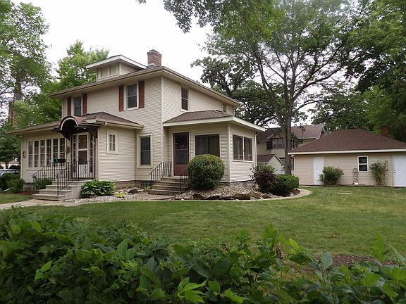 Turn of the century 2 story traditional, close to downtown and school. All permanent siding, central air, patio and 3 season porch. 3 bedrooms and bath up, main level has large living room with fireplace, huge formal dining room, eat in kitchen and 1/2 bath. Beautiful oak woodwork thru out and hardwood floors. 2 car garage and large patio. Call today! $209,900.