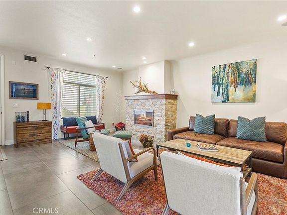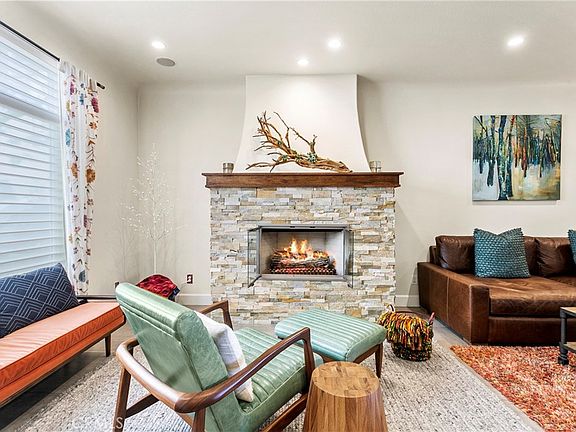 and a cozy stacked stone freplace, while the chef's kitchen features custom cabinetry, gleaming quartz