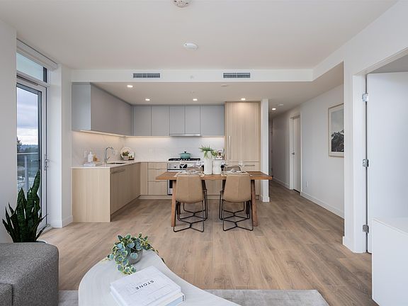 Welcome to SOCO by Anthem, a dynamic Master Planned community located in the heart of South Coquitlam. SOCO’s South Tower rises 28 storeys and includes 43,000+ square feet of indoor and outdoor amenities. Minutes from the Lougheed SkyTrain station and major highway networks, SOCO is connected in every sense of the word. This Northeast facing corner 2 bdrm and den home offers Mt. Baker views off the spacious balcony, perfect for catching the morning rays with a cup of coffee. The spacious L-shaped kitchen features integrated 30” Bosch and Fisher Paykel appliances, as well as plenty of room for prep work on the durable quartz countertops. Take advantage of year-round comfort with an efficient heat pump for cooling and heating.