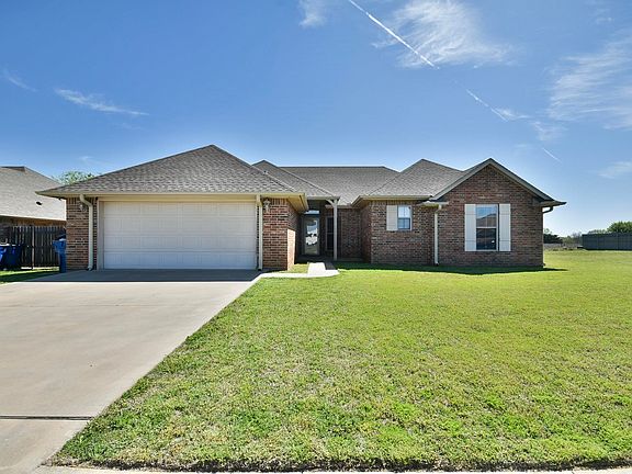 4 bedroom 2 bathroom home that was built in 2012. New paint, water softener system, and storm cellar in the garage. This home is a split floor plan with the primary bedroom on the North side of the home, and the other 3 bedrooms on the opposite side. Bullnosed edge sheetrock throughout gives it a custom feel. Open kitchen/dining/living room. Designated laundry room walkthrough to the attached double car garage. Privacy fenced back yard for when you sit under the covered patio. Contact Jade Smith, REALTOR with The Brokers Agency 580.470.5304 cell (text) for more information.