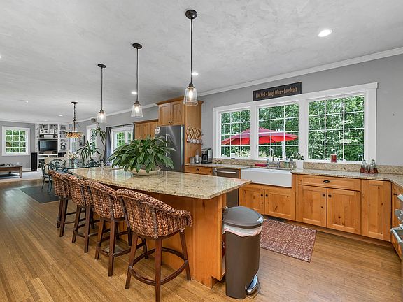 Stunning 3 Bedroom, 2.5 Bath, Colonial Home with 3,000 sq ft is set approx. 350 ft off the road, tucked into the woods atop Alton Mountain, yet only few minutes from Alton Bay & beautiful Lake Winnipesaukee. The open concept first floor offers a chef’s kitchen with beautiful custom cabinets, SS appliances, including a professional gas range with 6 burners, a griddle and double oven. There is also a large granite kitchen island with a separate sink and a walk-in pantry. From kitchen area you have access to the private back yard which includes a large patio, granite fire pit, fenced in back yard and even a Bocce court. To complete the 1st floor is your living room featuring a wood burning fireplace, private office and half bath. Upstairs offers the primary bedroom with its own Fireplace, custom stone shower, soaking tub & marble flooring in the bathroom. There is also a full bathroom that is shared with two additional bedrooms, a separate laundry room with utility sink and a family / game room with a wet bar. The Main house was built in 2006 with an attached carport added in 2012 featuring a vaulted beadboard ceiling, lit cupola and granite pillars with direct entry to the home. The Carriage House / In- Law Apt was built in 2017 that includes a four room Apt, full kitchen with quartz top countertops, washer & dryer, separate utilities, located above two car heated garage with radiant heat. The Apt is currently being leased for $1800 until Nov. 2023.