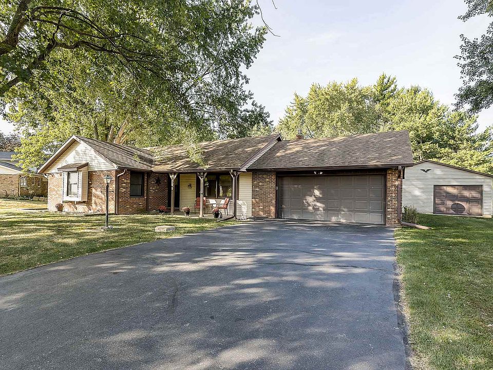 Things are looking up! Especially in this Brick Ranch Home with vaulted ceilings, exposed beams and skylights! Situated on nearly one half acre on the southside of town and in Western Schools, this home is near amenities yet away from the hustle and bustle. With 1,500 square feet, your home offers three bedrooms and two bathrooms, including Master Suite, and living room, kitchen with breakfast bar and Great Room with fireplace. Just through a sliding glass door off of the Great Room is another living space with exposed brick wall and door to your outdoor patio. In addition to the attached two car garage in front, the back of the property includes a detached one car garage and also shed with garage bay door. Mature trees line the open-sky backyard and offer extra privacy. In front, the covered front porch with corbels offers shade and a beautiful country view. Tour in person, and look forward to living here!