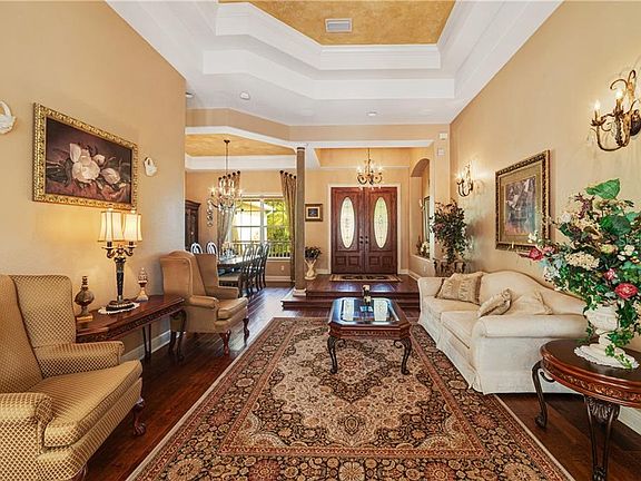 - Ceiling Fans(s), High Ceiling(s), Master Bedroom Downstairs, Split Bedroom, Stone Counters, Walk-In Closet(s), Crown Molding, Solid Wood Cabinets, Kitchen/Family Room Combo, Dry Bar, Tray Ceiling(s)