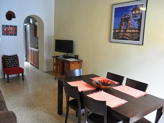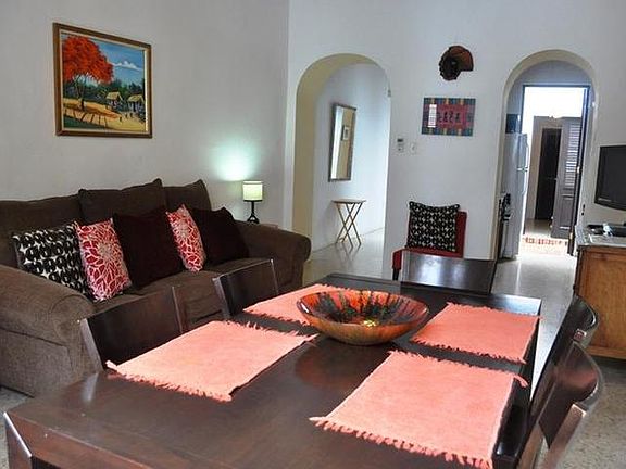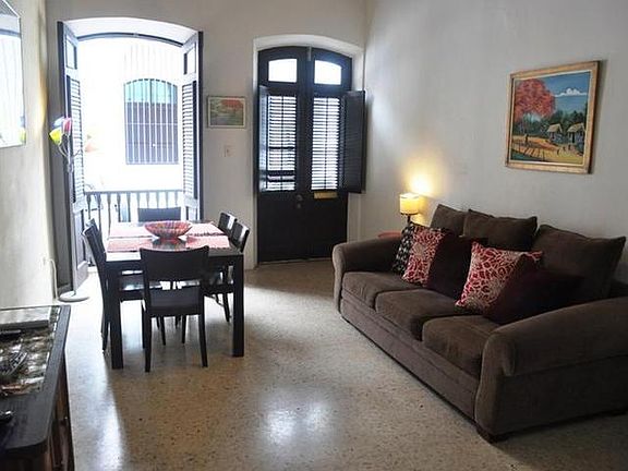 This awesome, economic rental 2 BR/ 2 BA house located in the heart of Old San Juan. The house is in a quiet, familiar neighborhood, just one block from the famous ocean walk and in walking distance to all main attractions of this charming Old City. The living space offers a nice size flat screen TV, Internet access ($), a dinner table for 6 as well as a sofa bed. The kitchen is equipped and opens to a small interior Patio which gives the home a great cross ventilation. The house has a master bedroom with bath room and a king size bed. The wooden doors are opening to one of the interior patios. The other bed room comes with its own bathroom and patio access to the second patio as well. All rooms have ceiling fans and the bed rooms have air conditioning. The house as well offers cable TV ($), wireless internet ($), washer/ dryer, microwave, hammocks.