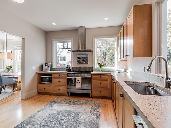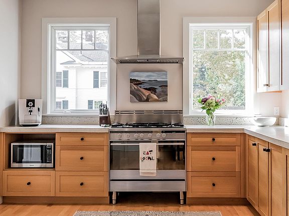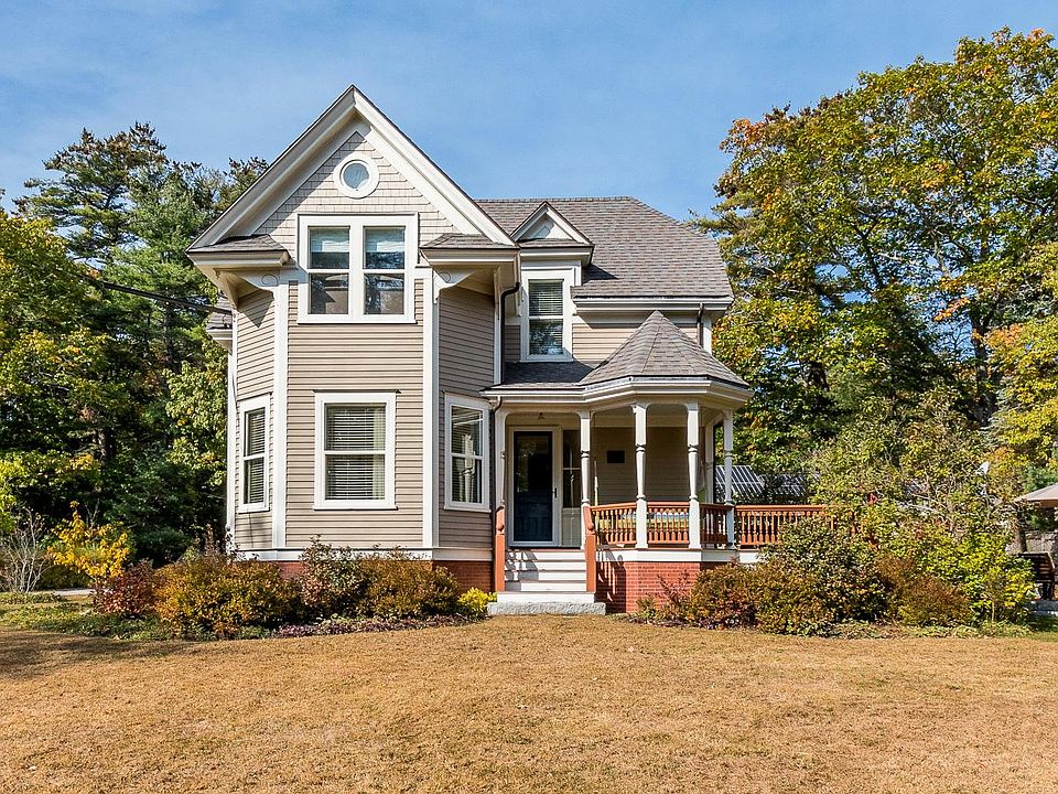 As featured in Maine Home & Design, the stunning historic architectural details of this 4 bedroom, 3.5 bath Victorian home in Falmouth Foreside are complemented by contemporary finishes and solar power. The small side road and tree-lined yard offer privacy and make the corner yard with a turret deck, patio, firepit and small pond, a peaceful sanctuary close to all of Falmouth's amenities. The great room is the perfect lounging area with cathedral ceilings, a gas fireplace and built-ins. The updated kitchen features stunning rift-sawn white oak cabinets, state-of-the-art and energy efficient appliances, stylish concrete countertops and oversized windows which allow for infinite sunlight. Golden maple floors carry you through a double-wide doorway to the formal dining room and the eat-in extension of the kitchen with a second fireplace and window bench to soak up the warm morning sun. Another classic Victorian feature are the series of pocket doors found throughout the house giving character and charm in addition to storage space. A sitting room with a large window leads you to the front entryway and staircase. The second level primary suite with the original port-hole window is polished and refined with a walk-in closet and a large ensuite bath with double vanities, soaking tub and tiled shower. The design takes full advantage of the classical details such as the gable roofline with shiplap ceilings in the primary suite and skylights in the fantastic office space. Another bedroom and full bath complete the second level. You will find a secondary ensuite in the finished basement, a large wine fridge, an extra room with built-ins, ideal for a media room or den. The seamless merge of historical and modern creates a truly beautiful home in the sought after town of Falmouth Foreside!