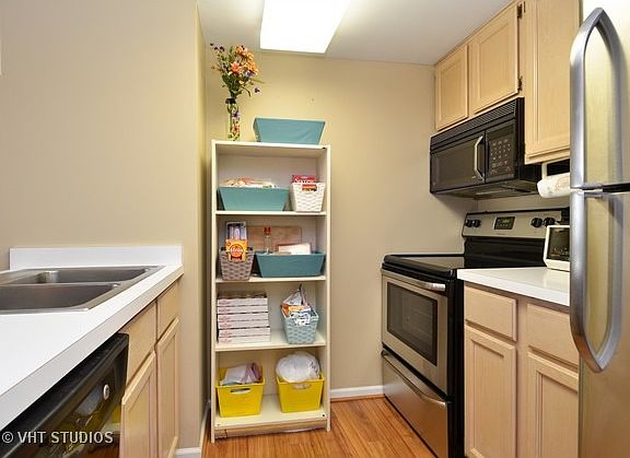 Great studio/jr. bedroom in elevator building. This sunny top floor unit is located in downtown Northfield. Recently updated kitchen features new stainless steel appliances and laminate flooring. Freshly painted. Full-size washer and dryer in unit. L-shape floor plan allows privacy in bedroom. Large sliding glass doors open to balcony. Heated garage parking and large storage unit. Conveniently located within walking distance to Mariano's, Walgreens, library and many restaurants.