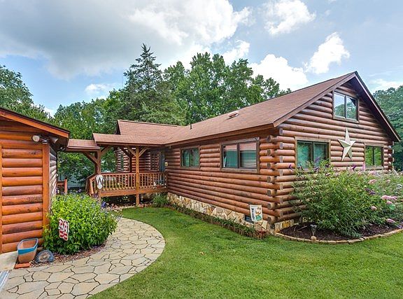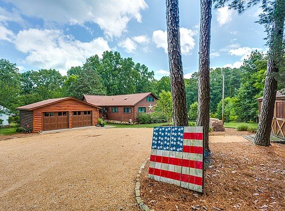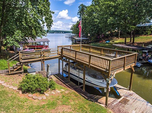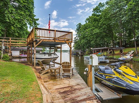 Charming 3 br 2.5 bath cabin on large waterfront lot at mile 10 in main lake cove- a perfect location close to all things Lake Gaston. Updated in 2013 with a fresh style that makes this home easy to love. Granite countertops in kitchen & baths, oak hardwood floors, ceramic tile floors & showers, glazed cabinets/drawers, gas range dbl oven & stainless appliances, copper sink. The family area/den is visually anchored by a floor-to-ceiling stone fireplace. Custom-made large window in the family living area overlooks beautiful established landscaping. Covered porch & deck lead to a terrace & large paved fire-pit & seating area. Double garage w/new doors & 2 sheds provide ample storage. Single boathouse w/ upper sundeck, dock area w/ jetski lift have great main lake views. Protected cove with great main lake access.