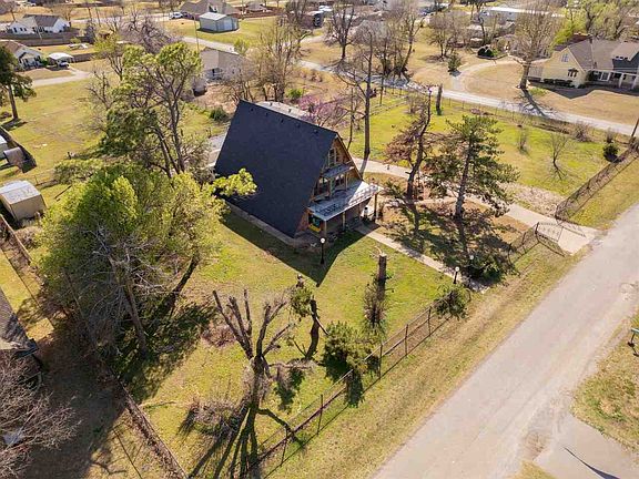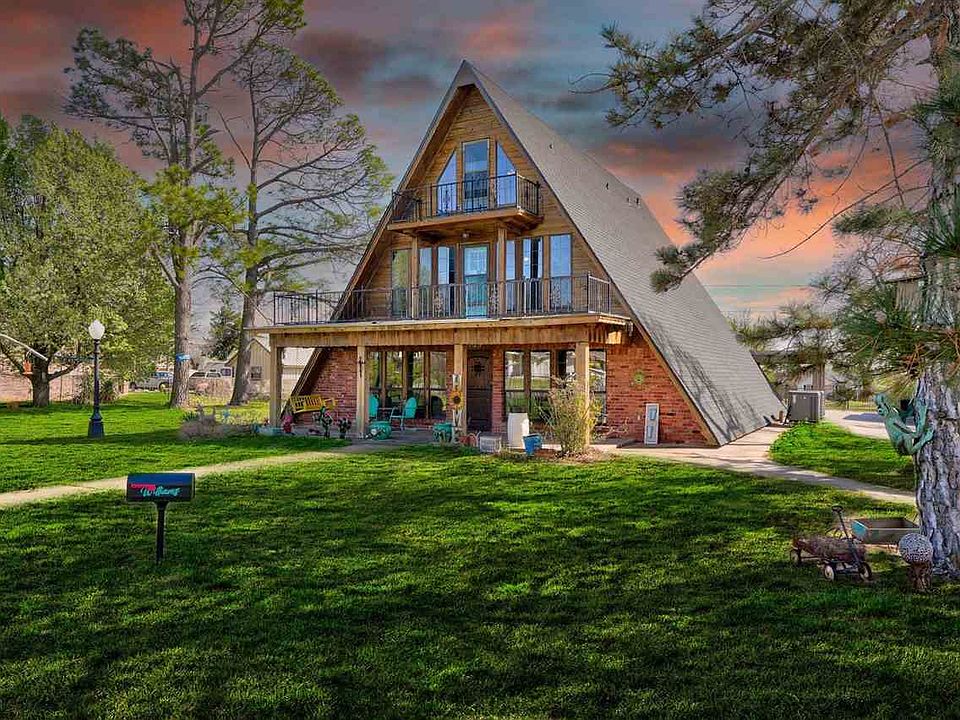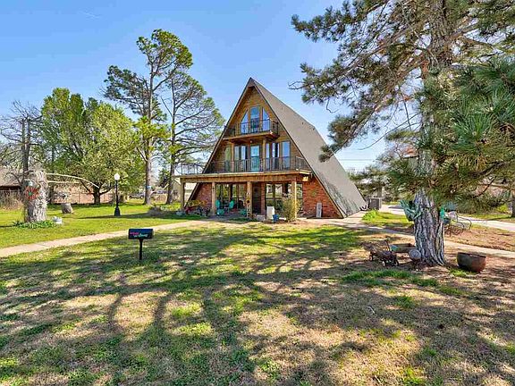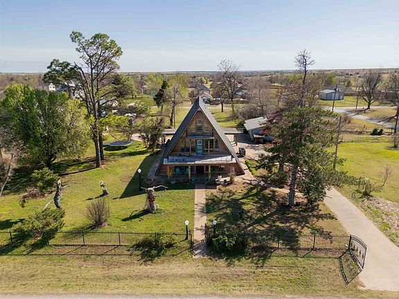 NEW LOWER PRICE: Your Dream Home Just Got More Affordable! Open your mind and see the true awe of this “unicorn-of-homes”. The spacious layout offers room for everyone and everything and 4 of the 5 bedrooms have a balcony. The large open living room is big enough for a sectional. The kitchen is a chef’s dream with custom cabinetry, new dishwasher(’23), concealed storage, undercabinet lighting, a massive pantry(12’wide), double ovens, reverse osmosis, and much more. Be sure to check out the virtual tour video for more information on all the kitchen has to offer. The primary suite is conveniently located on the bottom floor along with the utility room and a guest bathroom. This A-frame style home has no attic; all that storage is built into the home with nooks and crannies throughout. The entire property is fenced with wrought iron including the front yard, back yard & driveway and just shy of 1 acre. It also has 2 storage buildings, a separate garage/shop, carport, and a storm shelter. Another great feature is the large 16x18 sunroom, right off the primary bedroom. This is perfect for a large office space or craft room. Recent updates include downstairs HVAC (’22), class 4 high-impact roof and decking(‘20). Washer, dryer, and fridge(’23) are included with the home.