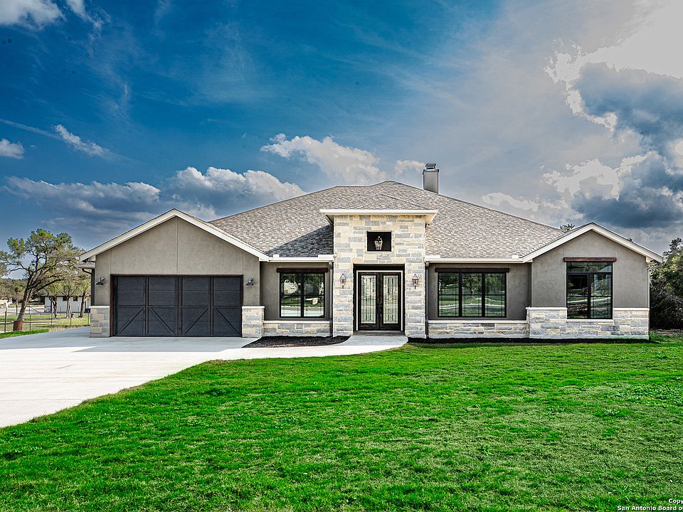 Sensational new build is the perfect place boasting over 3,500 square feet. Wonderfully located in an incomparable Comal County neighborhood. Step through 8' custom leaded glass front doors inside the barrel ceiling foyer and be captivated by 12' ceilings and the luxurious features this house offers with four bedrooms and three full baths. The open floor plan features a contemporary interior and contains large entertainment spaces, home office, flow-through living area, flow-through living/dining area, exercise room, sunroom, and fully wired media room. This house comes equipped with an efficient HVAC system, SONOS in-ceiling speakers, full exterior security cameras, Skybell doorbell, smart locks and garage-door openers, which makes it an ideal turn-key solution. This home is a technologist dream wired everywhere providing any work from home situation ideal! Enjoy cozy nights in front of the oversized stone fireplace with split logs in the living room or step out onto your covered patio with a second propane fireplace. Solid 8' custom wood doors throughout, custom Marvin exterior windows and solid pane glass, interior soundproofing, and blown-in insulation. Leading edge efficiency includes two Tesla Powerwalls combined with a whole-home Generac system. Plenty of room for you in the garage with four parking spots enclosed with fully insulated garage doors. Located off the garage is your private exercise room complete with rubber gym flooring and glass door to the backyard. The kitchen is a chef's dream come true with GE Cafe appliances, soft-close custom cabinets, custom vent hood, farmhouse sink, custom pendants and an oversized dine-in island with pot filler and propane cooking. Never fear - you have a 1,000-gallon oversized buried propane tank. The comfortably sized master suite is a secluded retreat that comes complete with a luxury en-suite bathroom, his-and-her walk-in closets, separate shower, soaking tub, and custom cabinetry. No expense has been spared with finish-out with top brands throughout. Step outside to the covered patio from your bedroom. Second bedroom boasts their own private hallway leading to a full bathroom and bedroom with large walk-in closet. Third and Fourth bedrooms are down an additional hallway all with walk-in closets. Enjoy a country atmosphere in the tranquil backyard equipped with a covered patio accessible through the full wall of glass slider doors. A perfect place for a morning coffee or afternoon cocktail. Patio is set and ready for your future summer kitchen and pool! You will have plenty of parking with your enormous driveway and stamped walkway to your front door. Don't miss out on owning this fabulous home. Schedule your private tour today!