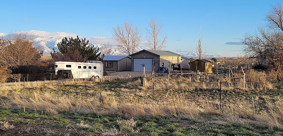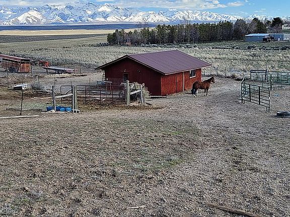 840 sqft covered deck with breathtaking view of the Rubies. 960 sq ft heated and insulated shop with crows nest storage. This comes attached to 576 Sq ft 2 car garage. Hobby shed and garden shed as well as covered car port. The lower half of the property is set up for chickens and horses or livestock. This features a net covered 20×40 chicken run that has been used as a garden, enclosed in a 78×90 corral/ paddock with run in shed. There is an addition 476 Sq ft horse barn/ shop that features a 8.5x 11 walk in cooler/ refrigeration room and also has a leantu and hitching rails. Property is adjacent and provides gate access to equestrian trails and blm access for adventuring with toys or horses. It also features beautiful mature landscaping with topsoil hauled in from wyoming, including but not limited to a variety of mature apple trees and plum trees. A campground style in ground flag stone fire pit and gazebo with electricity. Water and electricity access to all outbuildings as well as property paremeter for additional fire abatement.