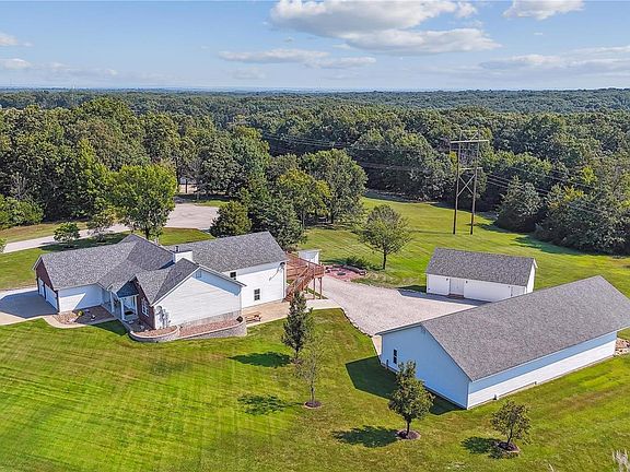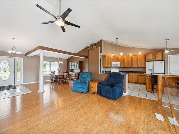 Stunning Ranch On 4 Lovely Acres With Outbuildings! This custom home with open floor plan features Bamboo wood flooring in vaulted dining room & living room with gas fireplace! Extensive kitchen with center island, 42 in cabinets & pantry flows into large breakfast room and huge vaulted great room! Large, vaulted master bedroom has luxury bath with 2-person whirlpool tub & walkin shower plus heated floors! Two additional bedrooms and 2nd full bath completes the main level! The finished walkout lower level has family room with wet bar, rec room, 2nd kitchen, mother-in law quarters, 2 full baths & 2 offices! Outbuilding #1 is 36 x 70. Outbuilding #2 has 2 levels 40 x 30 each, enough room for 17 cars! Other features include new roof 2024, 400 amp service & septic system certification! Quiet neighborhood with community stocked lake!
