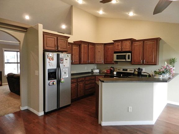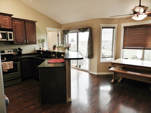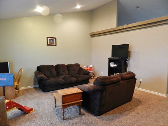 This home is located across the street from the Rigby High School in Sunbrook. Fully finished and landscaped yard including a fully automatic sprinkler system this home has a great curb appeal. The planter beds are easy maintenance and include perennial plants and rock. The home faces the west which means you can enjoy the shade on the back patio on those warm summer evenings. To the East you have a unobstucted view of the city and mountains. As you step up to the front porch you will notice the maintenance free decking material and the solid alder wood door. As you enter the home you will enjoy the large space in the living room with vaulted ceilings and plant shelves. The kitchen cabinets have a rich feel with cherry stained alder and hard wood floors. The master bathroom features a double sink vanity and a large jetted tub/shower combo with dual shower heads and custom tile, custom tile floor which is heated. Master bedroom has a wonderful trayed ceiling. The basement is completely finished with a very large family room with built in surround sound speakers and custom recessed lighting. There are an additional 2 bedrooms and bathroom in the basement along with the utility/storage room and a nice office/den area.