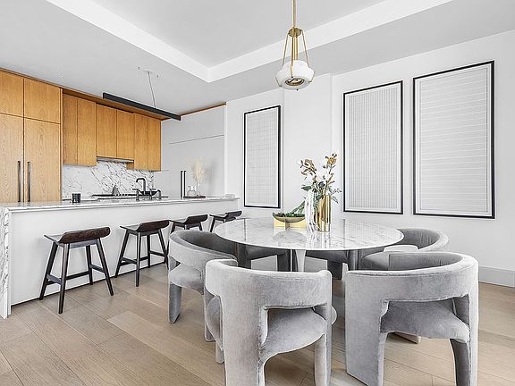 The layout of this residence is truly a dream for entertaining. The generously sized kitchen flows with ease into an open and expansive 23.25' x 14.50' living and dining area wrapped in floor-to-ceiling, acoustically insulated windows and doors that access the private terrace for seamless indoor-outdoor living. Custom oak cabinetry and Italian arabescato corchia natural stone countertops & backsplash highlight a spacious, custom-fit kitchen equipped with integrated Bosch Benchmark kitchen appliances and premium wine fridge. Southern and western exposures allow for endless picture-perfect sunsets and an abundance of natural light from dusk until dawn.