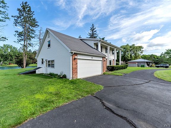 Let us move you in...to this stately Colonial in Springville, with gorgeous backyard views! Lovingly maintained by the original owner, who had it custom built in 1965. Enter the living room, with its gorgeous handpicked wooden beams and wood burning, double sided fireplace. Sliding glass doors take you outside to your open patio, and directly in front of the tranquil pond, the perfect sight for morning coffee or evening sunsets. The kitchen was updated in 2017, with granite countertops, plenty of cabinet space, pantry closet, and built-in KitchenAid appliances. The attached garage entrance takes you to the mudroom, with hook-ups for 1st floor laundry! Upstairs, all four bedrooms have gleaming hardwood floors, with two of the bedrooms double the standard size. The primary bedroom includes double closets, linen closet, wood burning fireplace, and en suite bathroom. Every room in the house is equipped with an intercom and radio system. The heating system is zoned by floor. Boiler & furnace 2016, bathrooms & windows ~ 2014, all vinyl flooring is brand new. Showings begin 7/24, negotiations begin 7/30 at 3pm. Open House 7/25 from 4-6 and 7/27 from 11-1.