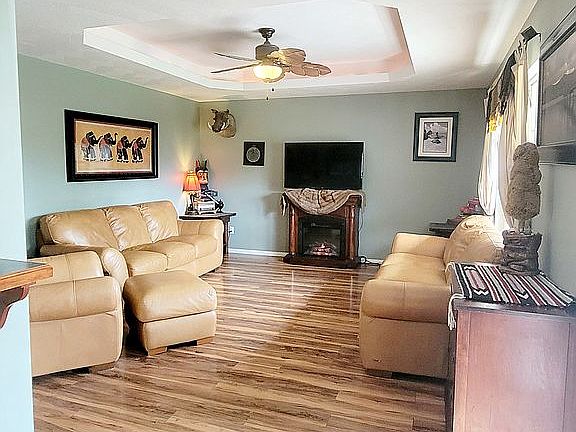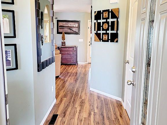 Pergo wood floors in the main area 2015. Carpeted bedrooms. Koi pond thats is temporary fenced. Garden fence . Large children's tree house. Privacy fence. Jetted tub and shower in on suite large vaulted bedroom. 4 mature trees for total privacy 9 months of the year. Large patio. Cedar closets. Lots of attic for storage. Work bench and shelves in garage. New storm doors 2014. new water heater 2018, all new stainless steel appliances 2016. An extra space in garage for tool bench.