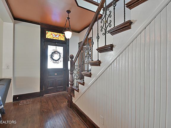 Welcome to this beautiful piece of history in historic downtown Lenoir City. A preserved piece of history, a captivating old home that exudes character and charm. It starts with a large wrap around covered porch we all dream about. Sit on a swing, enjoy the mountain and town views, chat or wave to the neighbors strolling by or just sit back and enjoy. This house is one of the grandest homes on the street and only 2 blocks from downtown Lenoir City. This beautiful Victorian home was built in 1907 and has some very unique features including built-in bookshelves, hardwood floors throughout, beautiful crown molding, woodwork, and wood details that will be sure to impress. This home is a true testament to timeless elegance. Generous living spaces grace the main level, presenting an inviting living room, sitting room that opens to the dining area, and a beautifully updated kitchen. There are beautiful built-ins and mantles throughout the house. The upper level has three spacious bedrooms, plus an office and an updated bathroom. The views of the Smoky Mountains and the Tennessee River from the upstairs bedrooms is impeccable. This home has an abundance of storage throughout the house and underneath the house. For a city home the house has lots of parking, it has a driveway in the front along with additional parking and a carport in the back. NOTE; the fireplaces are beautiful however they are not functional. This home is an absolute beauty. Don't hesitate! NOTE: this property is subject to historical restrictions and guidelines as are all homes in this Historic area. Schedule a viewing today to experience the magic.