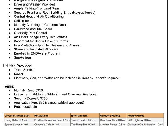 Located in a Historic neighborhood and vibrant area of Oklahoma City within walking and biking distance to Uptown, Midtown, Paseo District, and Goodholm Park. Short commute to downtown, Plaza District, and OU Health Center. Your new home is near restaurants, coffee shops, exciting nightlife and Historical OKC! Centrally-located, non-smoking, 2bedroom/2bathroom apartment with 6-month, 9-month, and one-year leases available. There are 9 parking spots for reserved for tenants (4 in the front and 5 in the back-fenced parking lot) Dryer and washer are included, and there is a monthly cleaning for the common areas, pest control every quarter and air filter change every 2 months. Pets are negotiable based on breed, and utilities can be included in rent. Rent can be paid with ACH autopay, Venmo, money order, and check.