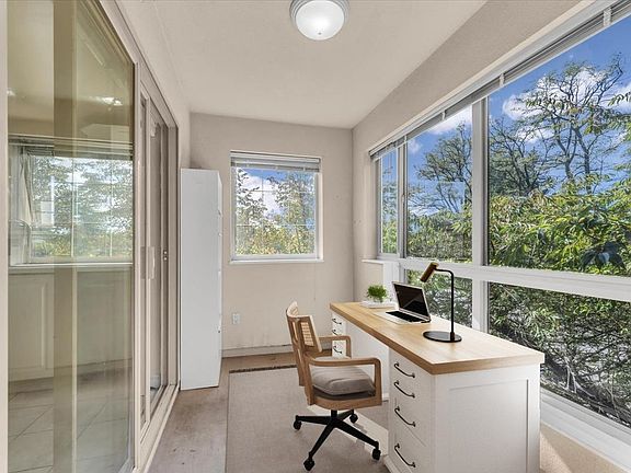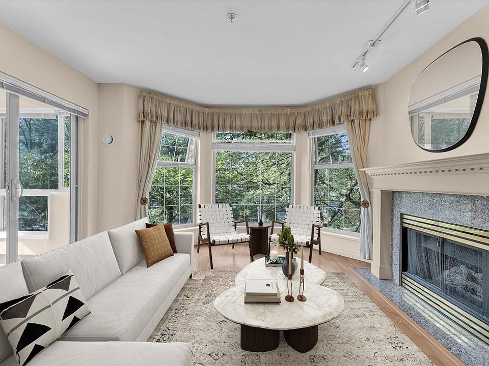 Discover the charm of this beautifully updated two-bedroom + solarium condo at Bloomfield Gardens. This home is the epitome of open concept living. The home offers versatility for an office, in-suite storage, hobby room and more. Elegant laminate and tile flooring flow throughout, paired with radiant heating and a cozy fireplace. Located near Oakridge Mall, high-end dining spots, and parks, this property falls within the catchment for Sir William Osler Elementary and Eric Hamber Secondary, making it an ideal choice for families. **Plus, the maintenance fee covers heat AND hot water!