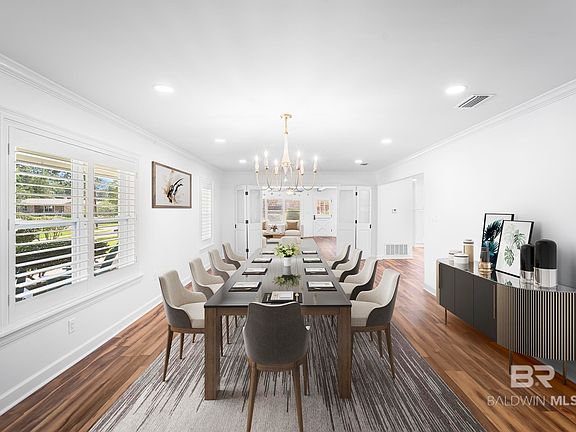 Must see this completely updated Fairhope home close to downtown and Fairhope West Elementary. This ranch style 3 bedroom 2.5 bath home sits on top of a small hill and has lots of natural light. With 2563 SQFT, this house offers loads of space and flexibility. Gourmet kitchen with gold pendants, eat-in island, breakfast area. Kitchen features quartz counters and a black walnut living edge wood island top, white cabinets, stainless appliances to include refrigerator, electric cooktop, microwave drawer. CoreTec luxury vinyl floors throughout. Smooth walls and ceilings. Formal dining room can also be used as a Den. Large living room with wood beams on ceiling. Primary suite has a large walk-in custom closet, vanity, separate shower. Spacious guest bedrooms share a hall bathroom. Half bathroom located near kitchen and living areas. Large laundry room with cabinets. Landscaped yard is a true gardener's delight. Walk out from the kitchen to the large covered back patio for outdoor entertaining. Pagoda. Partially fenced. Plantation shutters. Fortified roof 2022. HVAC 2021. Tankless water heater. Central vacuum system. Seamless gutters. Re-wired and replumbed. Renovated in 2019 by Swain Byrd Design. Double attached garage with storage area. Some of the pictures are virtually staged. Buyer to verify all information during due diligence.