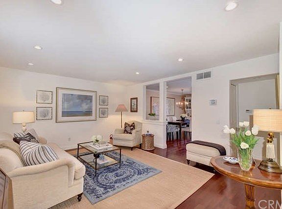 TURN-KEY town home with 2 master suites. This beautifully appointed town home lacks for nothing. Breath-taking rosewood floors add richness and elegance to this home. The formal living room opens to the dining area large windows filter natural light from one end of the first floor to the other. The remodeled kitchen is white and bright and boasts high-end appliances such as an Viking gas range/ oven, LG French door refrigerator & Bosch dishwasher. Beautiful natural stone kitchen counters with a breakfast bar. The garden window over-looks the courtyard. Two spacious master suites located on the second floor offer the ultimate in privacy. One bedroom features a fireplace. Both bathrooms have been remodeled with natural stones. Private courtyard with mature planting. Stroll to the beach and Main Street with all its' wonderful restaurants and unique shops. Only a five minute drive to three major freeways and 30 minutes or less to three major airports.