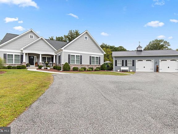 This versatile home with separate living quarters offers comfort, style, and modern living on one level, with additional finished basement space. Step into the bright and inviting living room, featuring hardwood floors, chair rails, crown molding, recessed lighting, a ceiling fan, and a cozy gas fireplace. The open dining area flows seamlessly from the living room and leads to a small deck, perfect for morning coffee or outdoor entertaining. The chef’s kitchen is the heart of the home, featuring gray granite countertops, a large island with a farm sink, 42-inch custom cabinetry, and upgraded stainless steel appliances, including a French-door refrigerator. The main level also includes two well-appointed bedrooms with hardwood floors, double-door closets, plantation shutters, and a full bath with tile flooring and a tub/shower combo. The spacious primary suite is a private retreat with hardwood floors, a barn-door walk-in closet, a tray ceiling, and a spa-like bath featuring stone tile flooring, dual vanities, and a stylish walk-in shower. Laundry hookups are conveniently located nearby. The partially finished walkout basement adds a massive amount of living space, including a recreation room, powder room, craft room, and abundant storage. A true highlight of the property is the fully equipped in-law suite, offering complete, independent living with its own entrance, it's own HVAC system, family room, full kitchen with granite countertops and stainless steel appliances, bedroom with double-door closet, jack-and-jill bath with walk-in shower, and a second laundry hookup—perfect for multigenerational living or long-term guests. Outside, multiple decks, a huge detached garage with full electric and workshop, a large pole building, and sprawling acreage provide endless possibilities for hobbies, storage, outdoor entertaining, and enjoying every season. Built in 2017 and meticulously maintained, this home combines modern amenities, timeless charm, and incredible versatility.