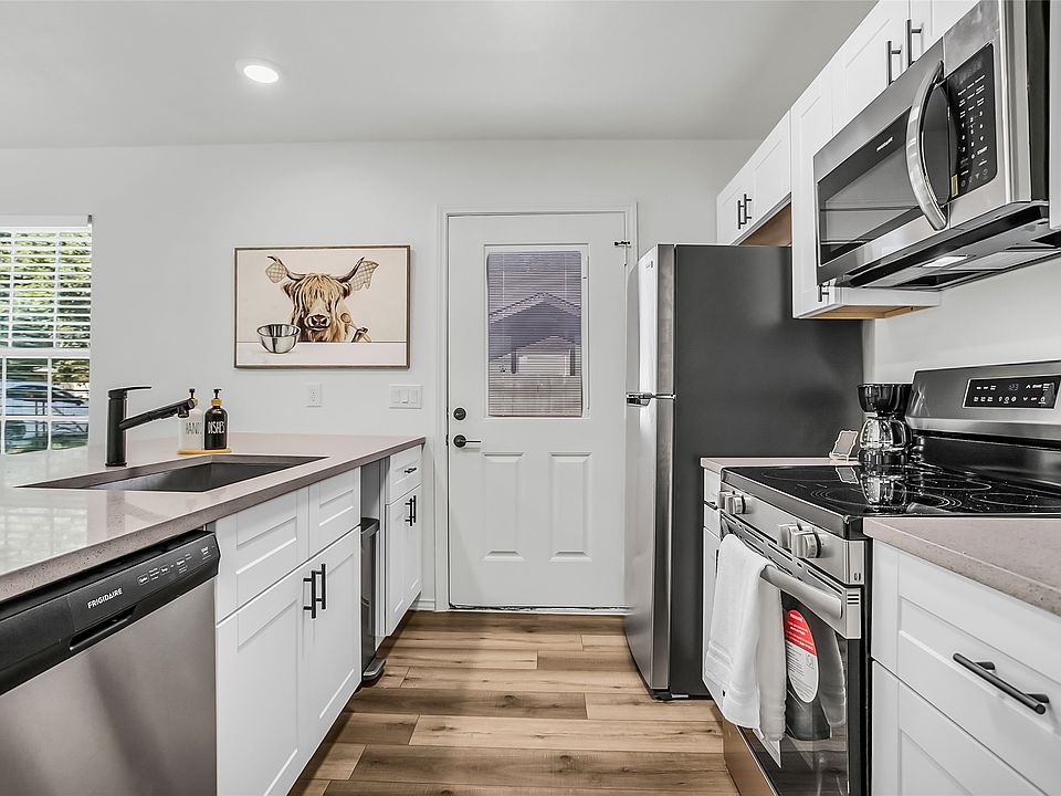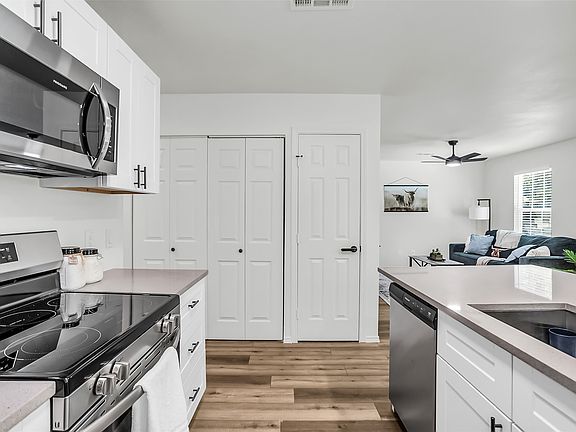 Move in with 0 down! Builder covering closing costs with preferred lender and title. Finally an affordable and stylish new home built with quality! Thoughtfuly designed to bring luxury looks to an afforable price point! Soft close kitchen cabinets, stainless steel appliances, LED lights throughout and ceiling fans in all bedrooms. You won't be disappointed when you walk into the large open living area with eat in kitchen and dining room. Full size laundry room with washer and dryer hookups. Incredible and efficient floor plan with plenty of storage space featuring large walk in closets in 2 of the bedrooms. Large primary suite with private attached full bath and walk in closet. Full size washer and dryer area. Fully fenced backyard which is a rare upgrade for new homes in this price range. Next to several neighborhood parks and a large green space. 2 car car port will be added over driveway before closing