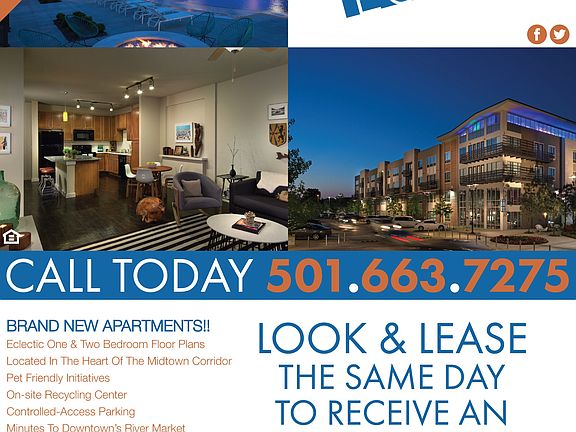 We offer 13 different floor plans to choose from Studio Lofts, One and Two Bedroom/Two Bath with washer and dryer included in every home. Resort style lounge pool with private cabanas, gas fire pit, gas grills and wet bar for relaxing and entertaining. 24hr fitness center and 24hr resident TV lounge featuring free WiFi and cable TV, and free Starbucks coffee and tea. Call or come by and see us today and be sure to ask about our current special of ONE MONTH FREE (*limited time only)