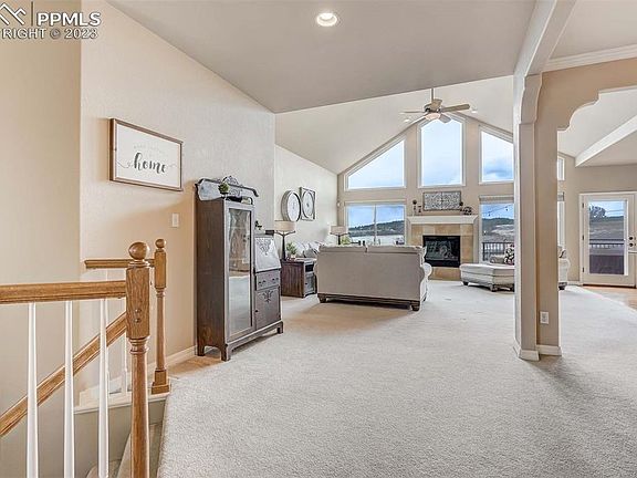 Welcome to this stunning Goetzmann semi-custom ranch home that exudes comfort & convenience. Located in the highly sought-after Homestead at Jackson Creek neighborhood, this property offers easy access to USAFA, restaurants, shopping, entertainment, parks, trails, D-38 schools, & main roads. Upon entering this beautiful home, you will be greeted by solid wd flrs that flow seamlessly throughout the foyer. The great rm features vaulted ceilings, a gas FP w/ tile surround, & a floor-to-ceiling wall of windows that allows natural light to flood the space, creating an inviting & open atmosphere. The formal dining rm has chandelier lighting, china cabinet bump out w/ sconces, crown molding, & an arched entryway. The gourmet kitchen is perfect for entertaining guests & features solid hardwd flrs, shaker style cabinets, a pantry, an expansive granite island w/ a breakfast bar, a dining nook, & SS appliances. Step outside from the kitchen to the fenced backyrd, complete w/ a large composite deck w/ metal railing & breathtaking mtn views. The main lvl primary bedrm is a retreat that offers a sitting area w/ access to the deck, a walk-in closet, & a private 5-piece bath w/ a dble vanity & jetted tub. Additional junior suite on the main lvl features a sitting area & private access to a full bath w/ granite vanity & custom frame mirror. Completing the main lvl is an office w/ French drs, vaulted ceilings, & a bay window that captures the stunning mountain views. The finished basement is perfect for entertaining guests, featuring an open family rm w/ a gas FP w/ stacked stone surround, a wet bar w/ loads of cabinets, bar seating, & a mini fridge. Two large bedrms w/ walk-in closets & easy access to a full bath w/ dble vanity complete the basement, unfinished 5th bedrm provides space for storage or a workout rm. Bonus items; central A/C, central vac, storage shed, pre-wiring for a spa, gas line on the deck, 2 newer water heaters, auto sprinklers, low maintenance stucco ext & more.