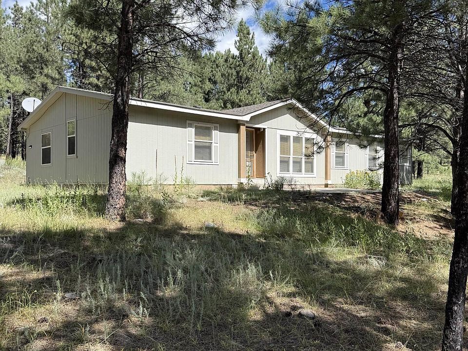 Spacious 3 bedroom/2 bath Doublewide on close to 10 acres. Home has formal living area and a large family area. Nice sized concrete pad in the front ready for outdoor enjoyment. Property is covered with trees and has a few nice open areas, there are some burnt trees towards the back of the property from the HPCC fire. Easy access.