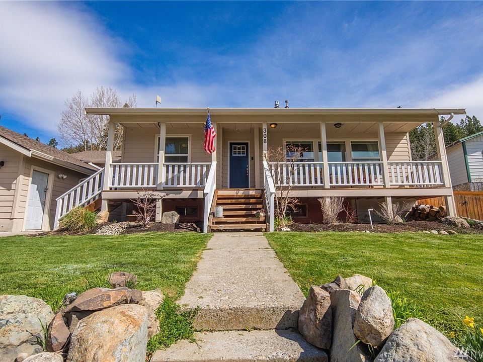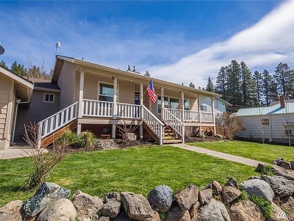 Great Location! This home is perched above town with views of Cle Elum on a double lot. Built in 2001 and very well maintained. Two bedrooms two bathrooms with an office. Vaulted ceilings, open concept and tons of storage. Outside you will find a two car garage, plenty of garden space, freshly painted front porch, back patio and lots of fruit trees! Close to town, trails and Suncadia.